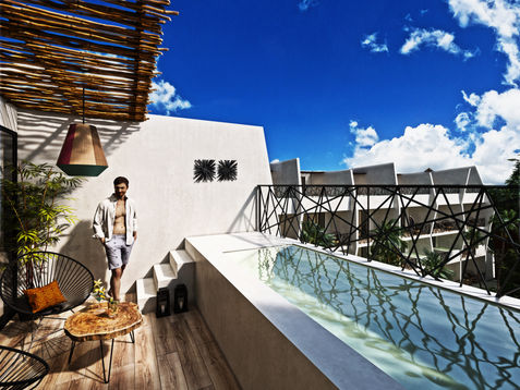 Dk Tulum es un escenario perfecto donde el centro del proyecto es la atracción principal, está diseñado desde el adentro hacia afuera, todo ocurre en el espacio central donde se encuentra la alberca de formas orgánicas que se mezcla con la vegetación selvática que se ha conservado y caminos de recorridos; donde hay hamacas, parillas, terrazas, gimnasio, yoga loft y hasta un temazcal que generan un ambiente de convivencia y de múltiples actividades del cual todos pueden disfrutar inclusive estando dentro de los departamentos ya que todos tienen vista exclusiva al área central.